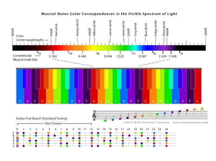 Die moderne Wissenschaft und Musiktheoretiker haben aufgezeigt, dass, wenn man die Frequenz eines Tones genügend erhöht – um mehrere Oktaven – man schließlich in den Bereich des sichtbaren Lichts gelangt.